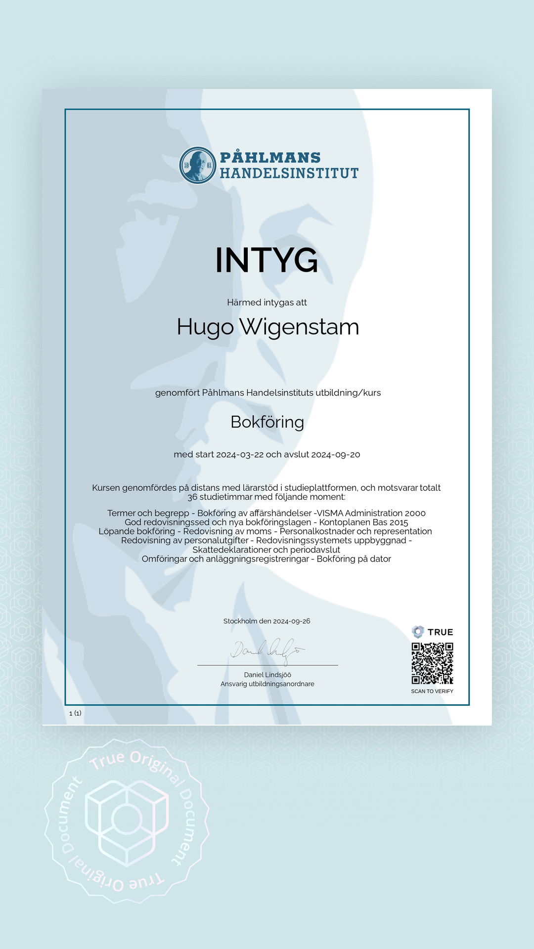Alla TRUE -document är säkrade med blockchain-teknologi och kan verifieras som äkta. Klicka på verifieringsknappen bredvid dokumentet eller skanna QR-koden med din smartphones kamera. Ingen app krävs - dokumentets äkthet verifieras omedelbart.